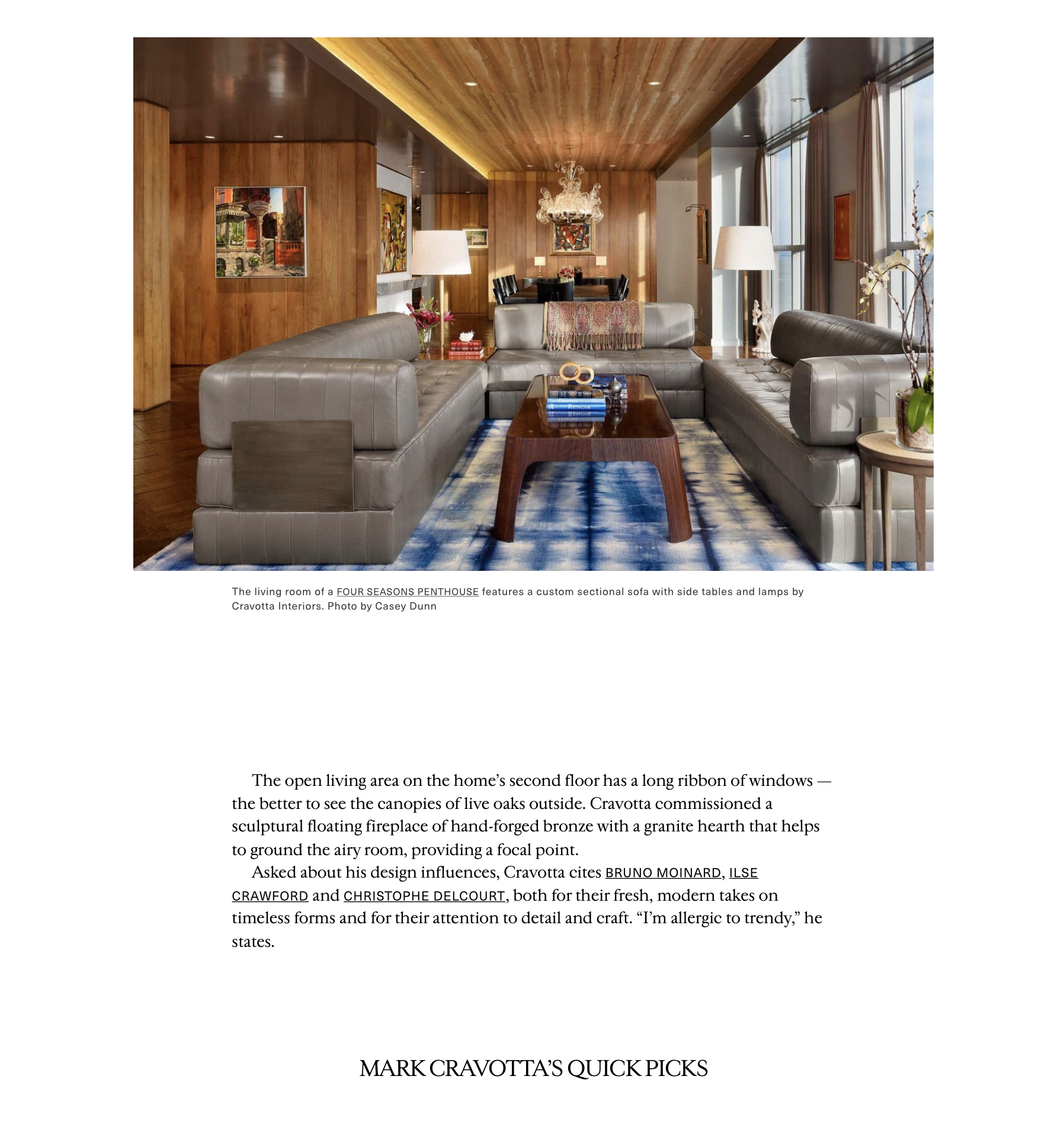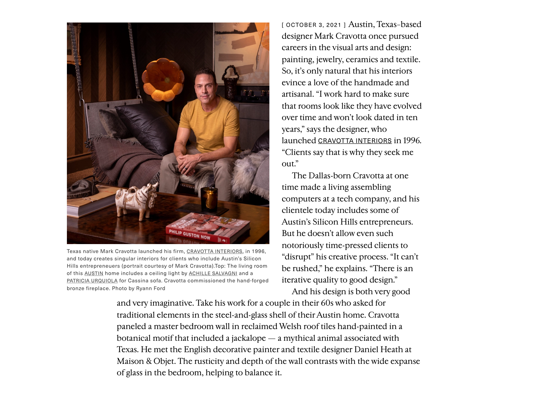 Austin, Texas–based designer Mark Cravotta once pursued careers in the visual arts and design: painting, jewelry, ceramics and textile. So, it’s only natural that his interiors evince a love of the handmade and artisanal. “I work hard to make sure that rooms look like they have evolved over time and won’t look dated in ten years,” says the designer, who launched CRAVOTTA INTERIORS in 1996. “Clients say that is why they seek me out.”