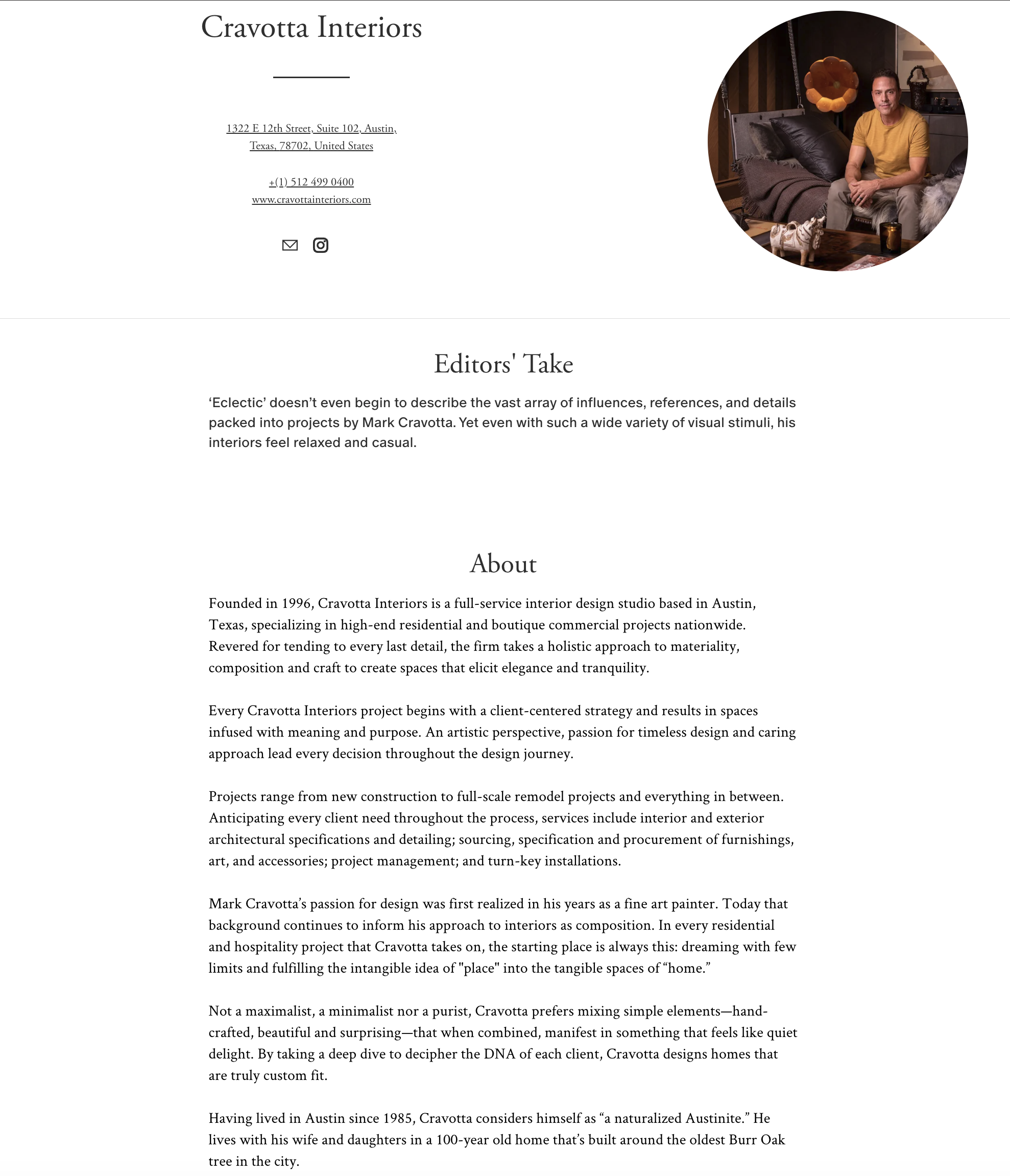 “"Eclectic' doesn't even begin to describe the vast array of influences, references, and details packed into projects by Mark Cravotta. Yet even with such a wide variety of visual stimuli, his interiors feel relaxed and casual.”