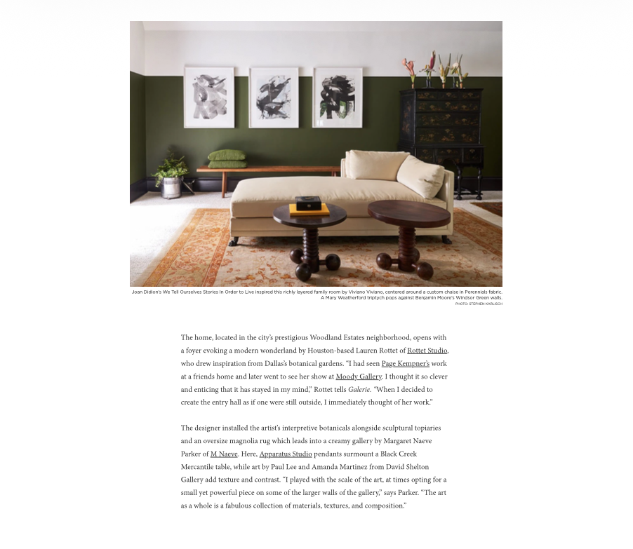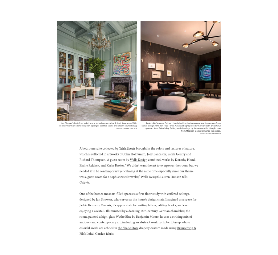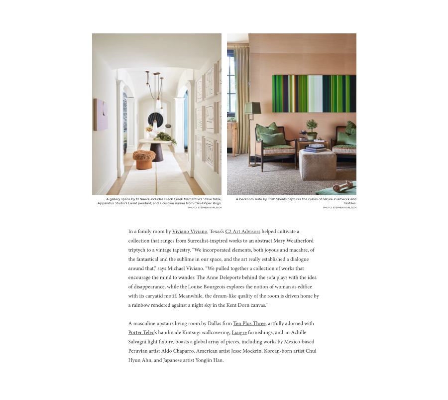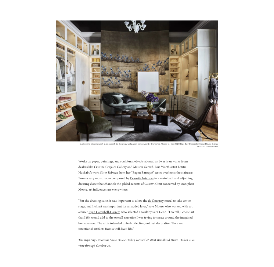 Works on paper, paintings, and sculptural objects abound as do artisan works from dealers like Cristina Grajales Gallery and Maison Gerard. Fort Worth artist Letitia Huckaby’s work Sister Rebecca from her “Bayou Baroque” series overlooks the staircase. From a sexy music room composed by Cravotta Interiors to a main bath and adjoining dressing closet that channels the gilded accents of Gustav Klimt conceived by Doniphan Moore, art influences are everywhere.