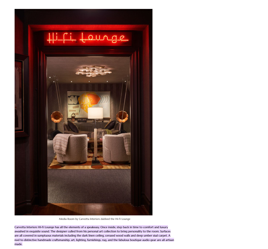"Carvotta Interiors HI-Fi Lounge has all the elements of a speakeasy. Once inside, step back in time to comfort and luxury awashed in exquisite sound. The designer culled from his personal art collection to bring personality to the room. Surfaces are all covered in sumptuous materials including the dark linen ceiling, cerused wood walls and deep umber sisal carpet. A nod to distinctive handmade craftsmanship, art, lighting, furnishings, rug, and the fabulous boutique audio gear are all artisan made."